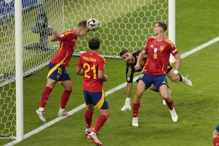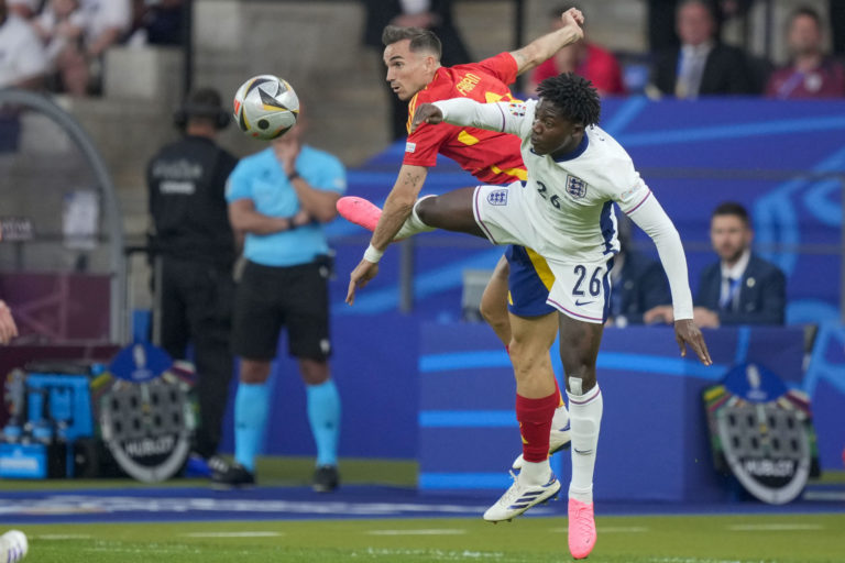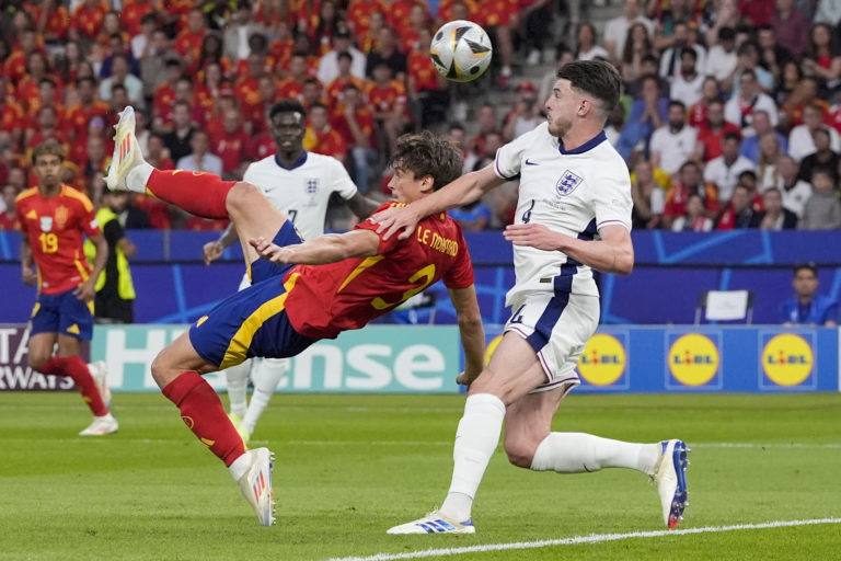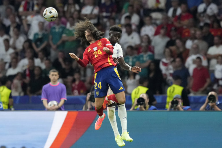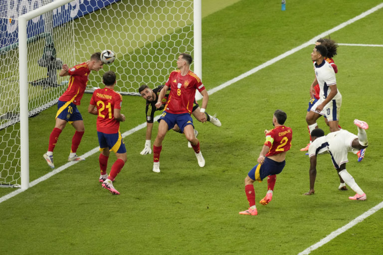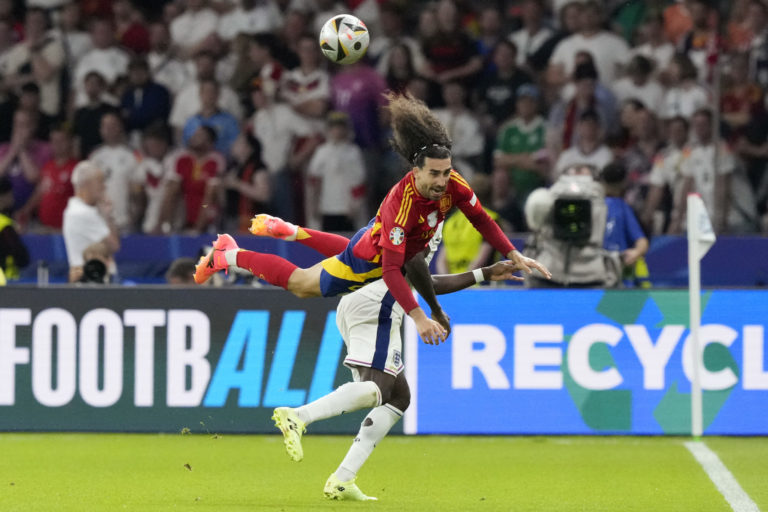 Španielsky reprezentant v hlavičkom súboji s Angličanom Bukayom Sakom počas finálového zápasu na ME vo futbale 2024. Berlín, 14. júl 2024. Foto: SITA/AP.