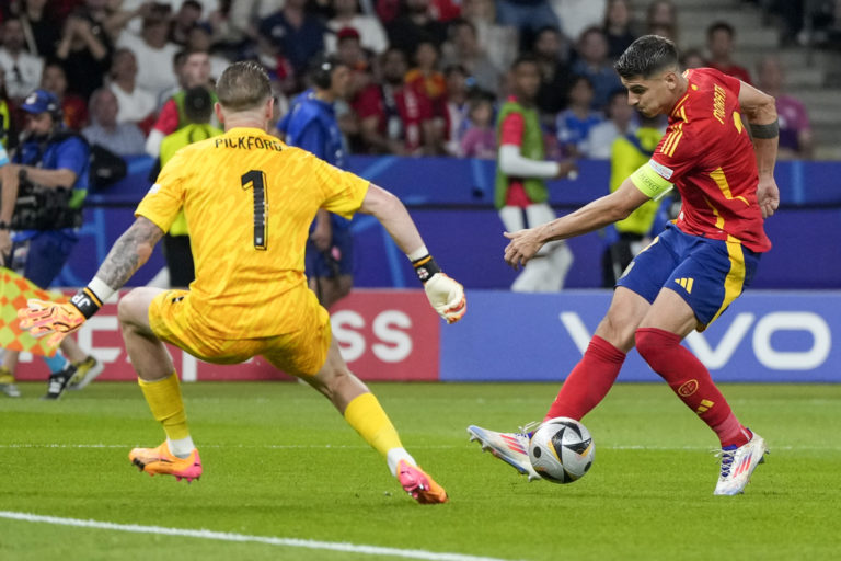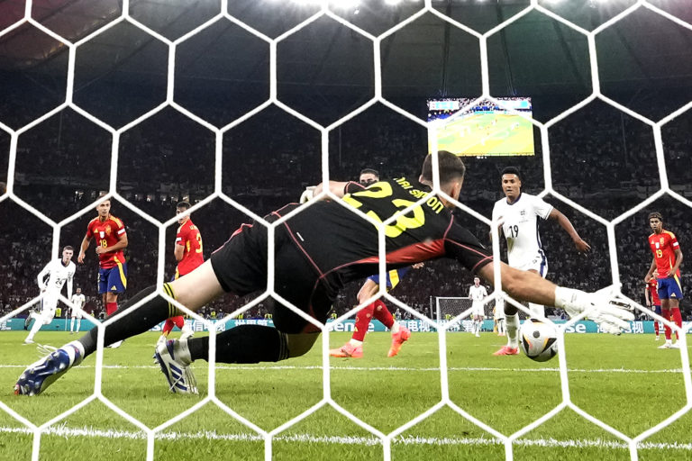Fantastický zákrok španielskeho reprezentanta Daniho Olma, ktorým zabránil vyrovnaniu na 2:2 v závere finálového zápasu ME vo futbale 2024 proti Anglicku. Berlín, 14. júl 2024. Foto: SITA/AP.