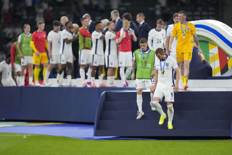 Smutní anglickí reprezentanti po finálovom zápase na ME vo futbale 2024, v ktorom podľahli Španielom 1:2. Berlín, 14. júl 2024. Foto: SITA/AP.