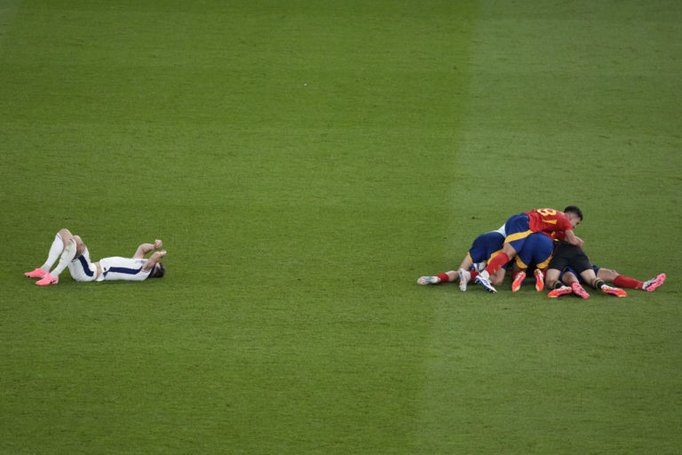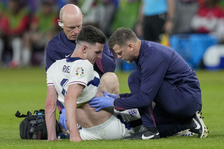 Ošetrovaný anglický reprezentat Declan Rice počas finálového zápasu na ME vo futbale 2024 proti Španielsku. Berlín, 14. júl 2024. Foto: SITA/AP.