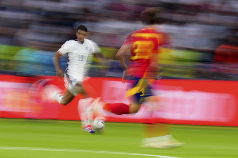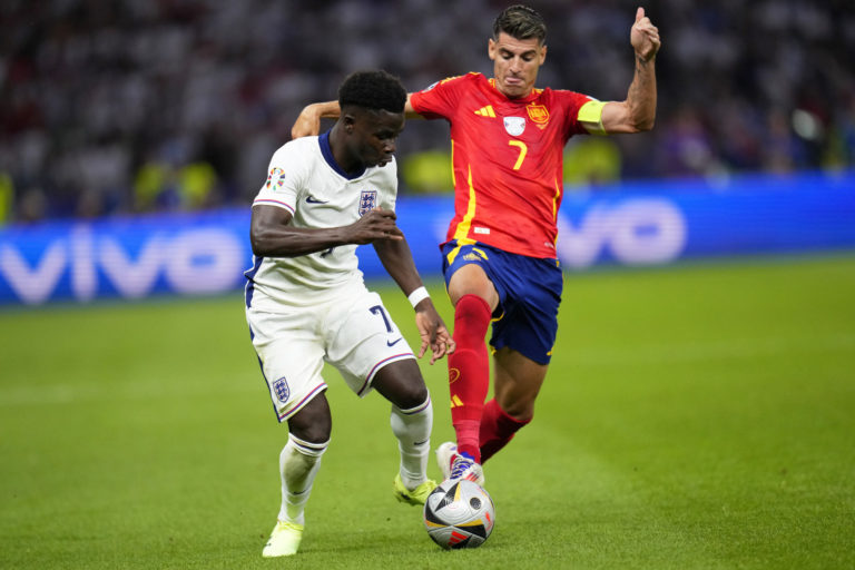 Anglický reprezentant Bukayo Saka v súboji so Španielom Álvarom Moratom počas finálového zápasu na ME vo futbale 2024. Berlín, 14. júl 2024. Foto: SITA/AP.
