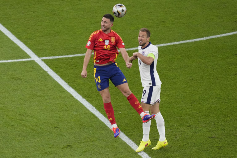 Španielsky reprezentant Aymeric Laporte hlavičkuje loptu pred anglickým útočníkom Harrym Kaneom počas finálového zápasu na ME vo futbale 2024. Berlín, 14. júl 2024. Foto: SITA/AP.