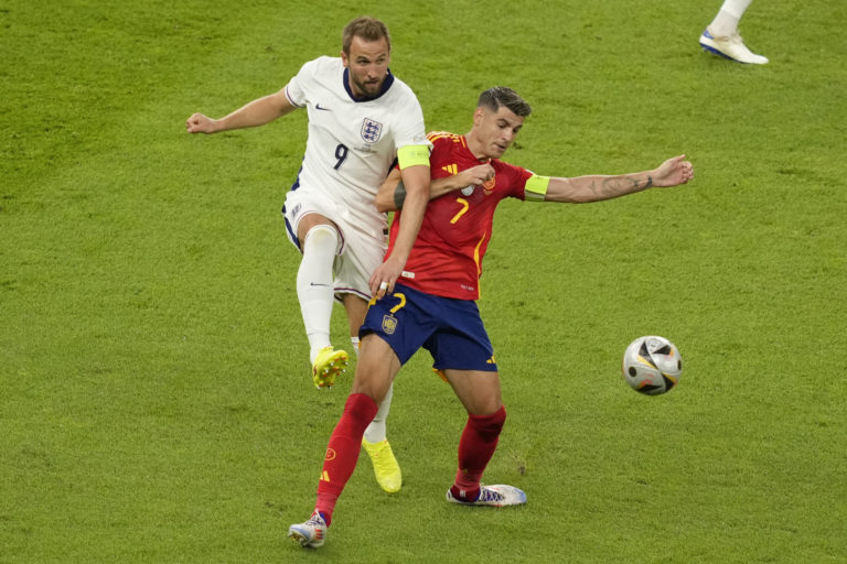 England's Harry Kane challenges for the ball with Spain's Alvaro Morata during the final match between Spain and England at the Euro 2024 soccer tournament in Berlin, Germany, Sunday, July 14, 2024. (AP Photo/Andreea Alexandru)
