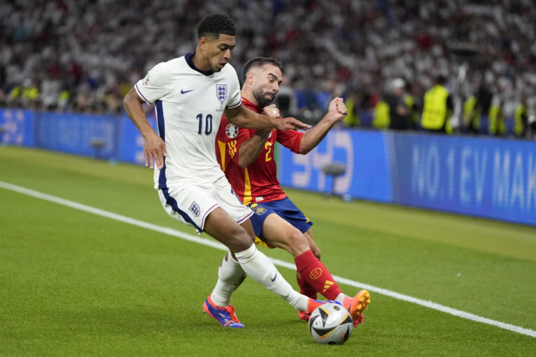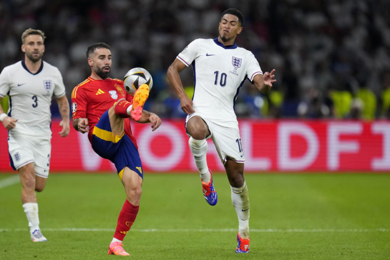 Španiel Dani Carvajal v súboji s anglickým reprezentantom Judeom Bellinghamom počas finálového zápasu na ME vo futbale 2024. Berlín, 14. júl 2024. Foto: SITA/AP.