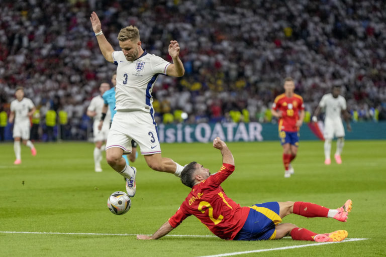 Anglický reprezentant Luke Shaw padá po súboji so Španielom Danim Carvajalom počas finálového zápasu na ME vo futbale 2024. Berlín, 14. júl 2024. Foto: SITA/AP.