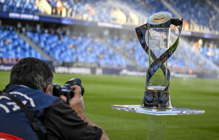 Trofej je vystavená na trávniku pred finálovým zápasom majstrovstiev Európy vo futbale hráčov do 21 rokov medzi Anglickom a Nemeckom na Národnom futbalovom štadióne v Bratislave v sobotu 28. júna 2025. Foto: SITA/AP