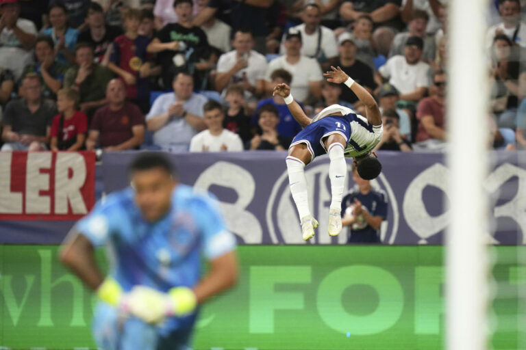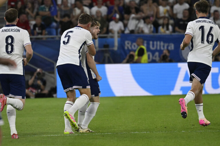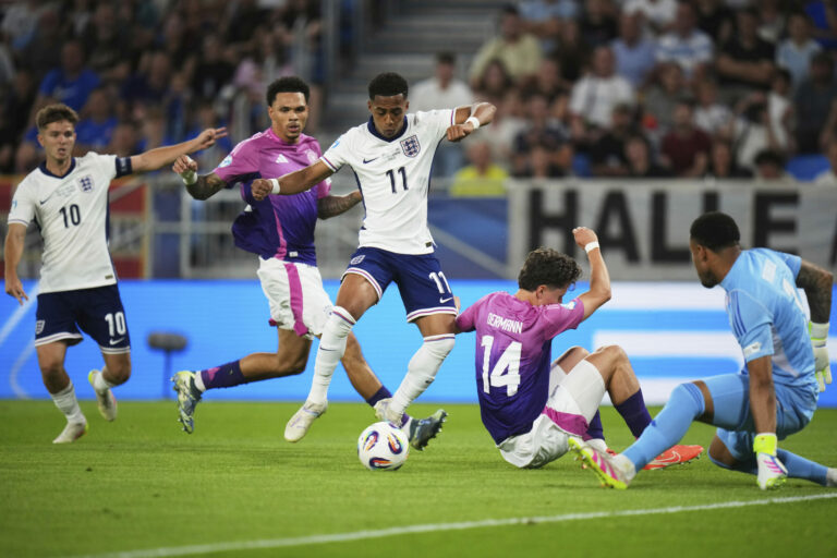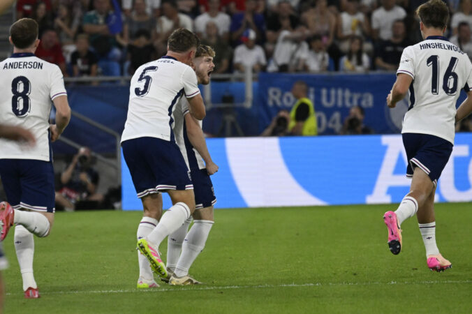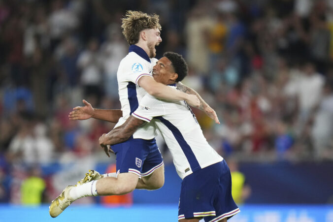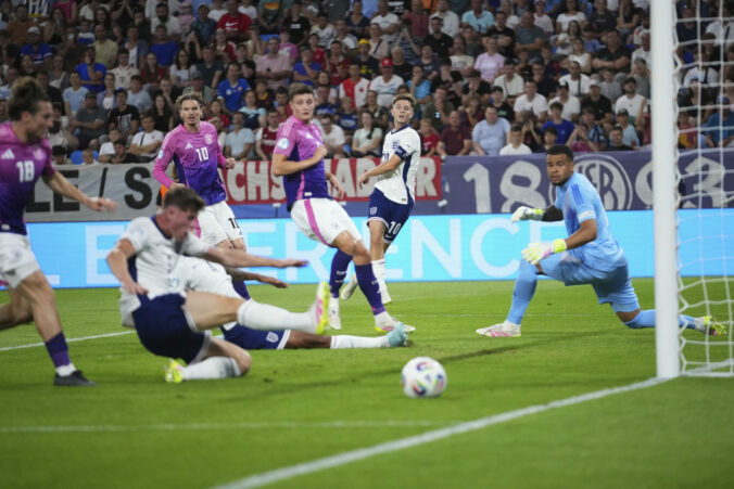 Angličan Omari Hutchinson (v pozadí) strieľa druhý gól svojho tímu počas finálového zápasu majstrovstiev Európy vo futbale hráčov do 21 rokov medzi Anglickom a Nemeckom na Národnom futbalovom štadióne v Bratislave v sobotu 28. júna 2025. Foto: SITA/AP
