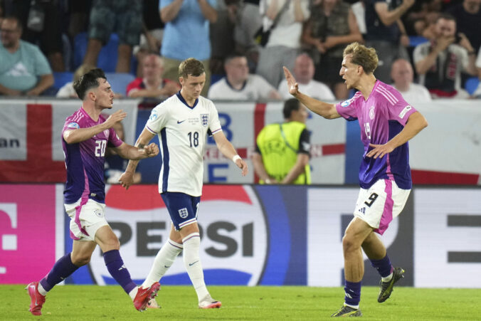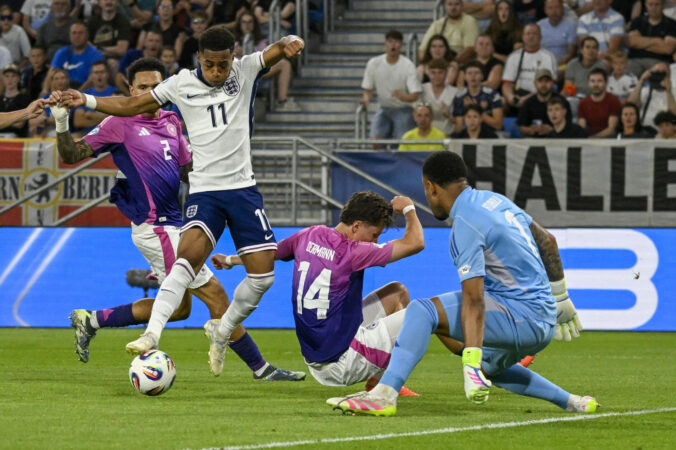 Anglický brankár James Beadle (uprostred) nedokáže zastaviť prvý gól Nemca Nelsona Weipera vo finálovom zápase majstrovstiev Európy vo futbale hráčov do 21 rokov medzi Anglickom a Nemeckom na Národnom futbalovom štadióne v Bratislave v sobotu 28. júna 2025. Foto: SITA/AP