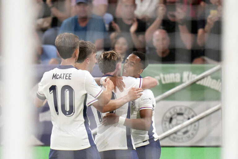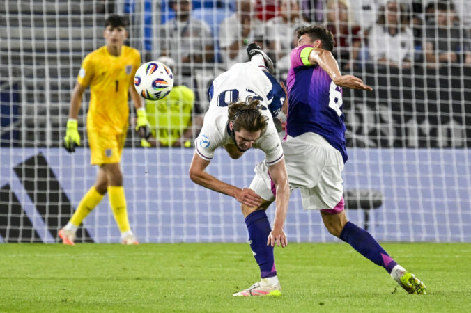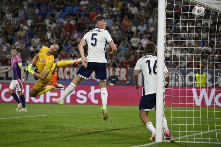 Angličan Jonathan Rowe strieľa tretí gól svojho tímu počas finálového zápasu majstrovstiev Európy do 21 rokov vo futbale medzi Anglickom a Nemeckom na Národnom futbalovom štadióne v Bratislave v sobotu 28. júna 2025. Foto: SITA/AP
