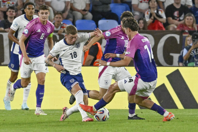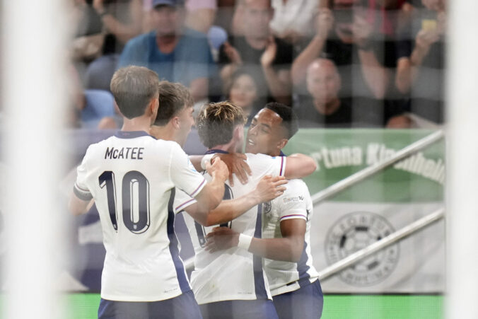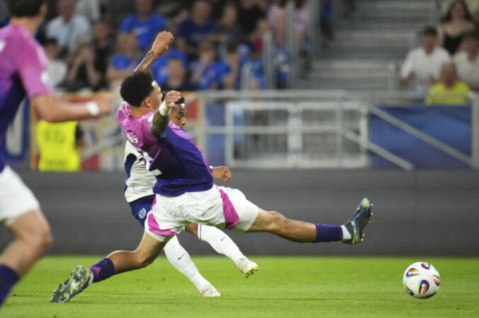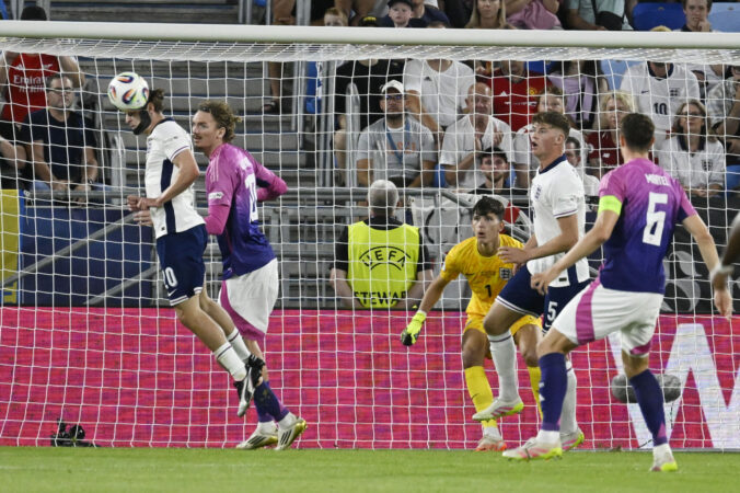 Angličan James McAtee (v pozadí uprostred) sleduje svoj krížny pas počas finálového zápasu majstrovstiev Európy do 21 rokov vo futbale medzi Anglickom a Nemeckom na Národnom futbalovom štadióne v Bratislave v sobotu 28. júna 2025. Foto: SITA/AP