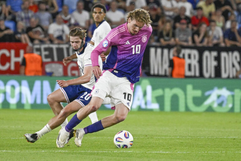 Zľava v popredí: Scott Alex z Anglicka a Martel Eric z Nemecka počas finále 25. majstrovstiev Európy 2025 vo futbale hráčov do 21 rokov EURO U21 2025 medzi Anglicko - Nemecko. Bratislava, 28. jún 2025. Foto: SITA/Milan Illík