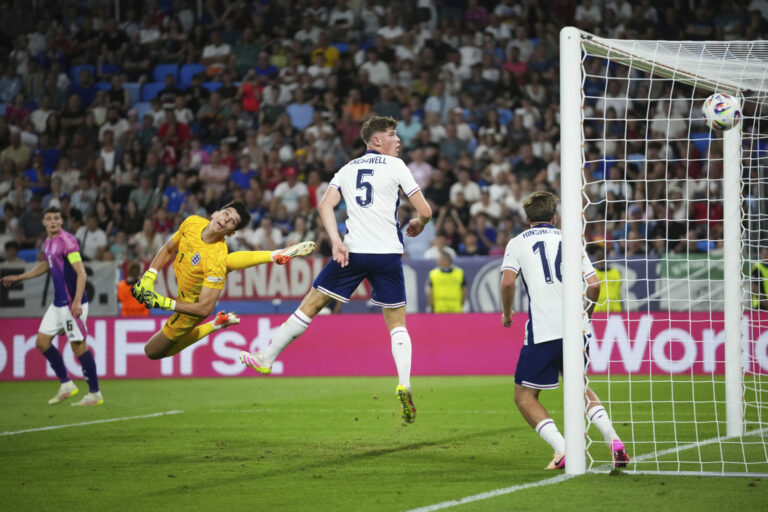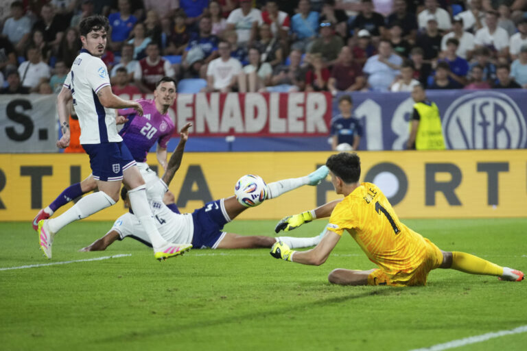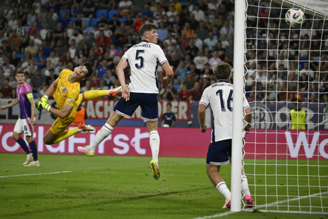 Anglický brankár James Beadle chytá počas finálového zápasu majstrovstiev Európy do 21 rokov vo futbale medzi Anglickom a Nemeckom na Národnom futbalovom štadióne v Bratislave v sobotu 28. júna 2025. Foto: SITA/AP