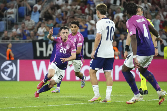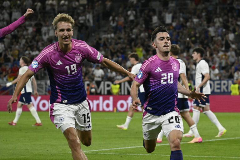 Nemecký hráč Paul Nebel (vľavo) sa teší po strelení druhého gólu svojho tímu počas finálového zápasu majstrovstiev Európy vo futbale hráčov do 21 rokov medzi Anglickom a Nemeckom na Národnom futbalovom štadióne v Bratislave v sobotu 28. júna 2025. Foto: SITA/AP