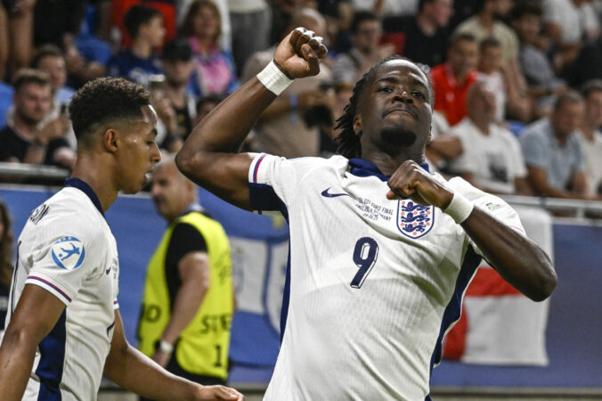 Angličan Omari Hutchinson oslavuje po strelení druhého gólu svojho tímu vo finálovom zápase majstrovstiev Európy vo futbale hráčov do 21 rokov medzi Anglickom a Nemeckom na Národnom futbalovom štadióne v Bratislave v sobotu 28. júna 2025. Foto: SITA/AP