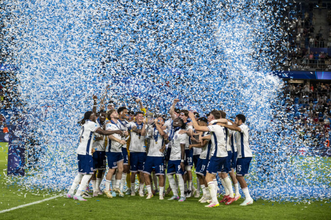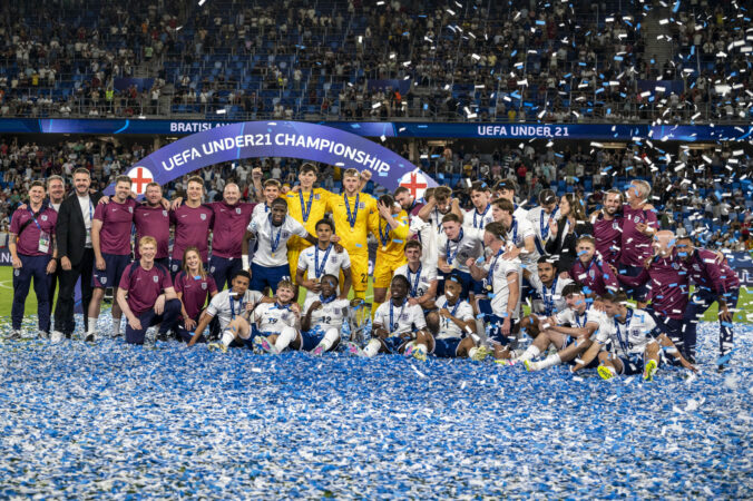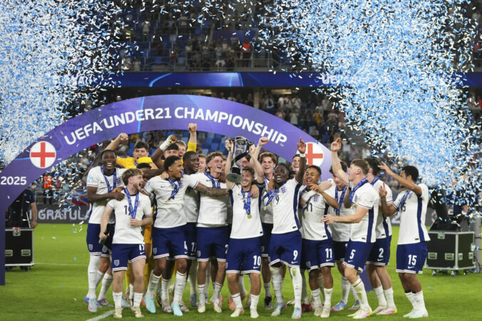 Víťazní futbalisti Anglicka po finálovom zápase 25. majstrovstiev Európy hráčov do 21 rokov (EURO U21 2025) medzi Anglickom a Nemeckom. Bratislava, 28. jún 2025. Foto: SITA/Milan Illík