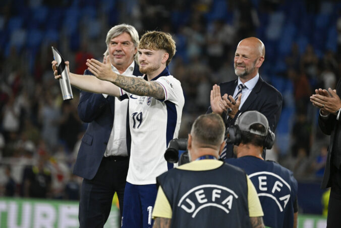 Angličan James McAtee dvíha trofej po víťazstve vo finálovom zápase majstrovstiev Európy do 21 rokov vo futbale medzi Anglickom a Nemeckom na Národnom futbalovom štadióne v Bratislave v sobotu 28. júna 2025. Foto: SITA/AP