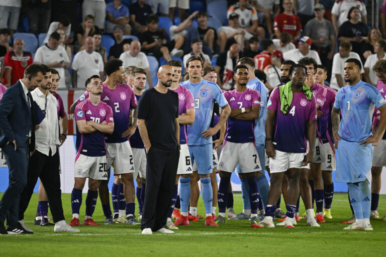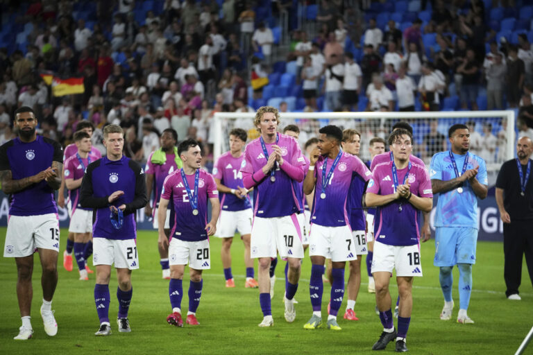 Hráči Nemecka tlieskajú fanúšikom po prehratom finálovom zápase majstrovstiev Európy do 21 rokov vo futbale medzi Anglickom a Nemeckom na Národnom futbalovom štadióne v Bratislave v sobotu 28. júna 2025. Foto: SITA/AP