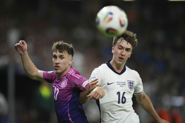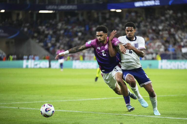 Nemec Brajan Gruda bojuje o loptu s Angličanom Jackom Hinshelwoodom (vpravo) počas finálového zápasu majstrovstiev Európy vo futbale hráčov do 21 rokov medzi Anglickom a Nemeckom na Národnom futbalovom štadióne v Bratislave v sobotu 28. júna 2025. Foto: SITA/AP