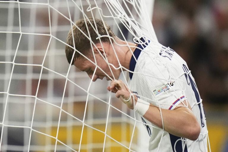 Anglický hráč Jay Stansfield sa opiera o bránkovú sieť po tom, čo sa mu nepodarilo skórovať počas finálového zápasu majstrovstiev Európy do 21 rokov vo futbale medzi Anglickom a Nemeckom na Národnom futbalovom štadióne v Bratislave v sobotu 28. júna 2025. Foto: SITA/AP