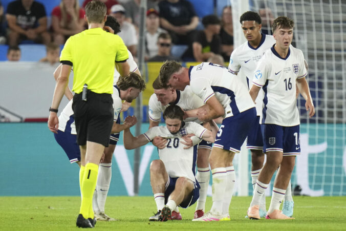 Anglickému futbalistovi Alexovi Scottovi pomáhajú spoluhráči po zranení počas finálového zápasu majstrovstiev Európy do 21 rokov vo futbale medzi Anglickom a Nemeckom na Národnom futbalovom štadióne v Bratislave v sobotu 28. júna 2025. Foto: SITA/AP