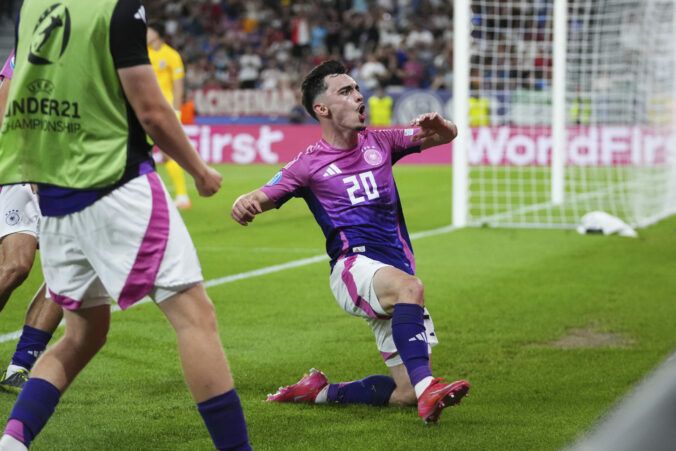 Nemecký hráč Paul Nebel oslavuje po strelení druhého gólu svojho tímu počas finálového zápasu majstrovstiev Európy vo futbale hráčov do 21 rokov medzi Anglickom a Nemeckom na Národnom futbalovom štadióne v Bratislave v sobotu 28. júna 2025. Foto: SITA/AP