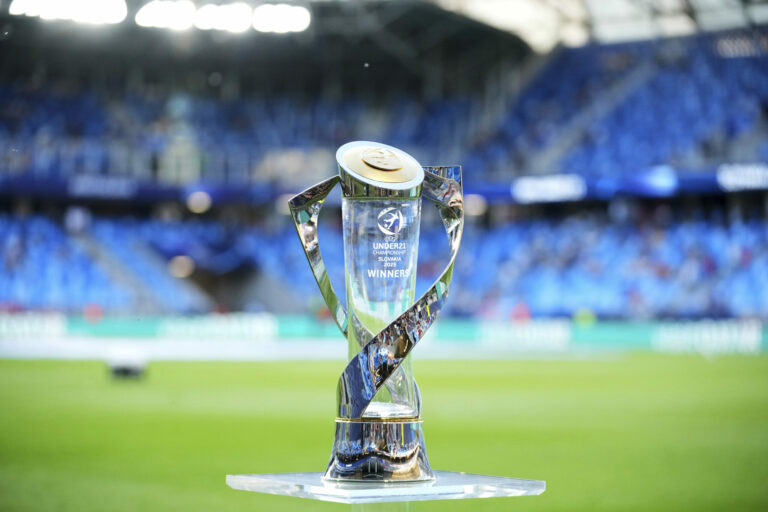 Vystavený víťazný pohar pred finále 25. majstrovstiev Európy 2025 vo futbale hráčov do 21 rokov EURO U21 2025 medzi Anglicko - Nemecko. Bratislava, 28. jún 2025. Foto: SITA/Milan Illík