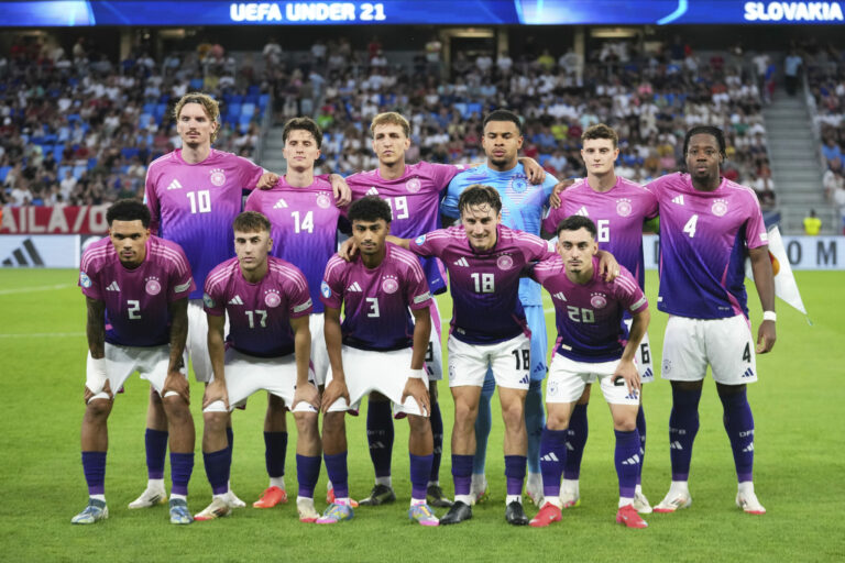 Hráči Nemecka pózujú pred finálovým futbalovým zápasom majstrovstiev Európy hráčov do 21 rokov medzi Anglickom a Nemeckom na Národnom futbalovom štadióne v Bratislave v sobotu 28. júna 2025. Foto: SITA/AP