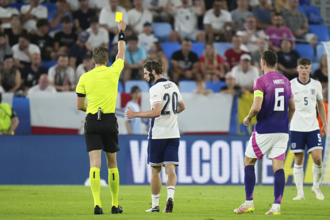 Rozhodca Sander van der Eijk ukazuje žltú kartu anglickému hráčovi Alexovi Scottovi počas finálového zápasu majstrovstiev Európy vo futbale hráčov do 21 rokov medzi Anglickom a Nemeckom na Národnom futbalovom štadióne v Bratislave v sobotu 28. júna 2025. Foto: SITA/AP