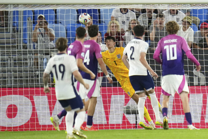 Anglický brankár James Beadle nezabránil druhému gólu Nemecka počas finálového zápasu majstrovstiev Európy vo futbale do 21 rokov medzi Anglickom a Nemeckom na Národnom futbalovom štadióne v Bratislave v sobotu 28. júna 2025. Foto: SITA/AP