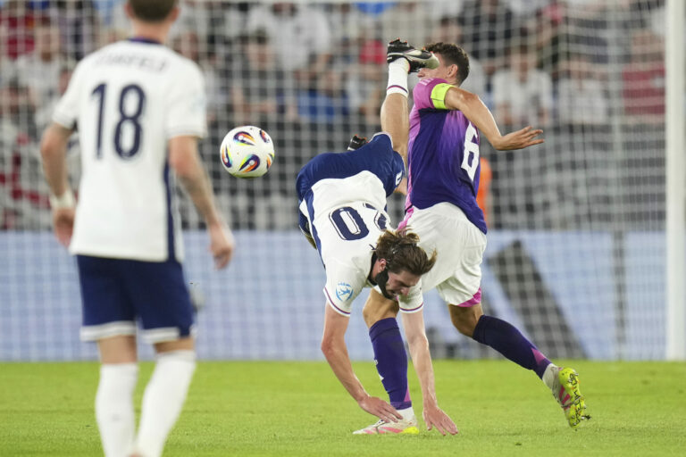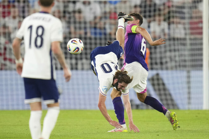 Angličan Alex Scott padá na zem v súboji s Nemcom Ericom Martelom počas finálového zápasu majstrovstiev Európy vo futbale hráčov do 21 rokov medzi Anglickom a Nemeckom na Národnom futbalovom štadióne v Bratislave v sobotu 28. júna 2025. Foto: SITA/AP