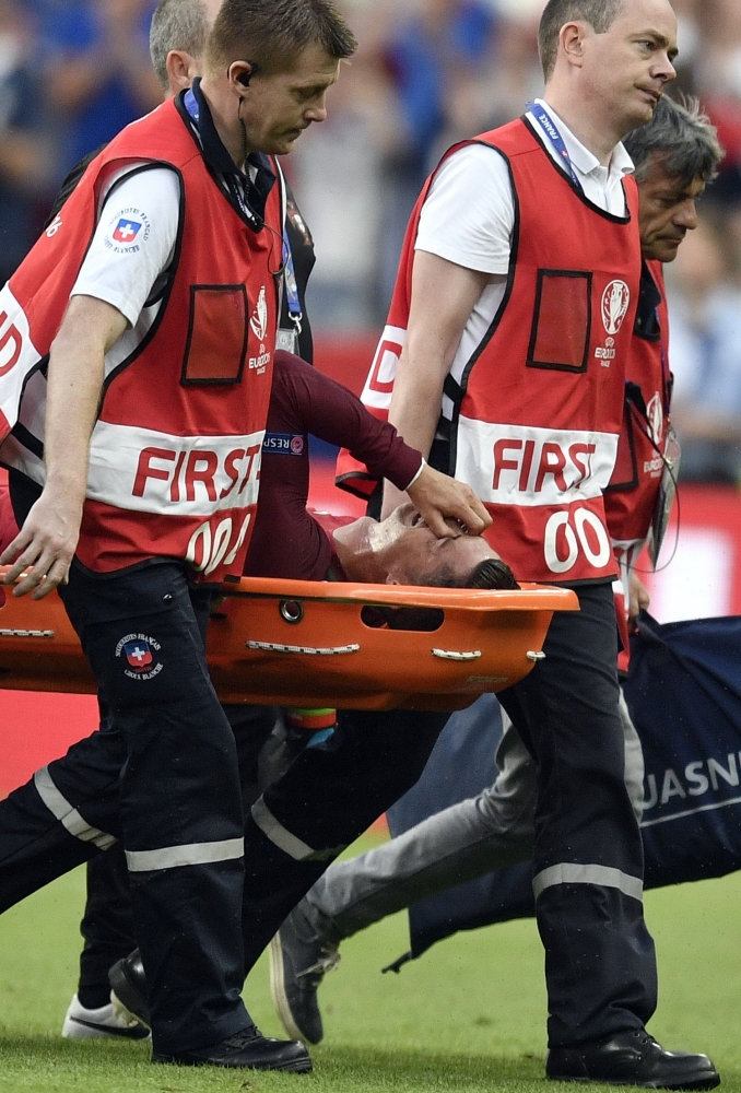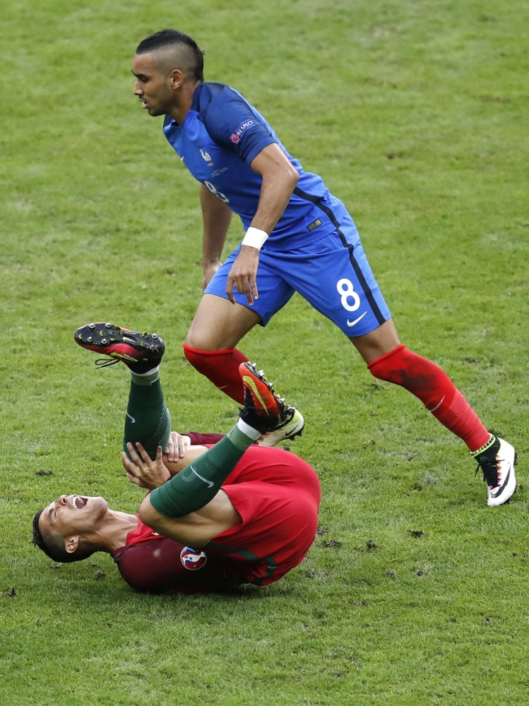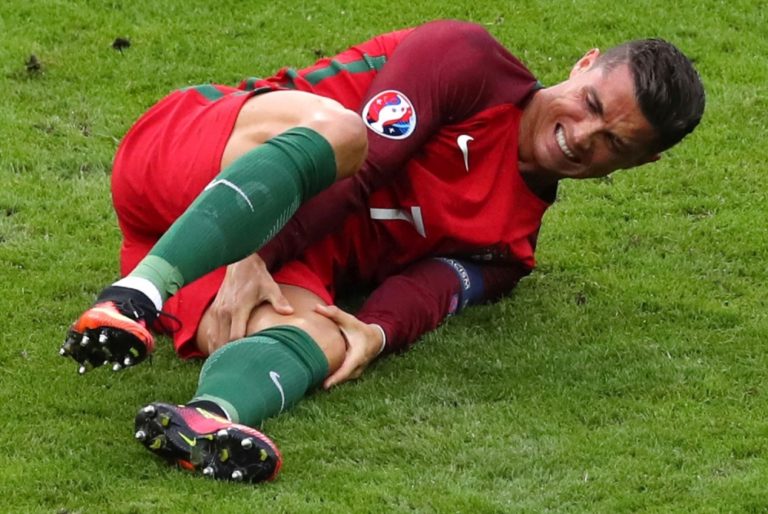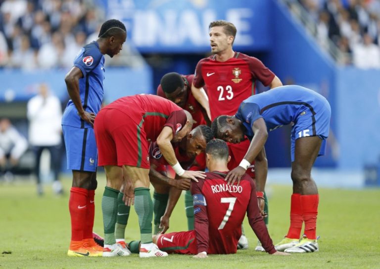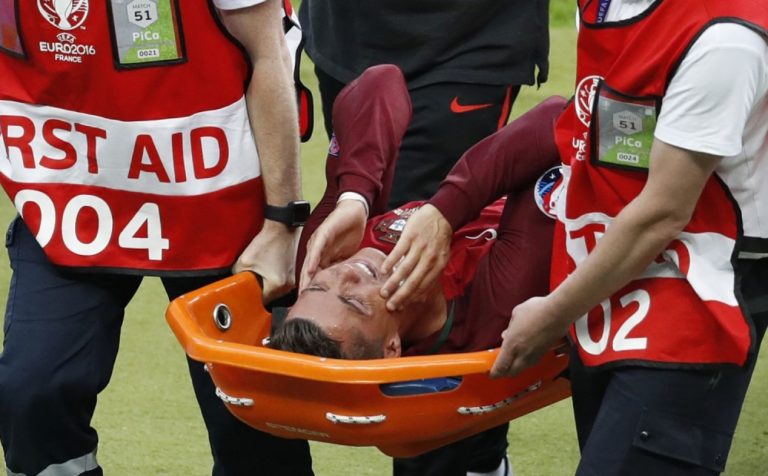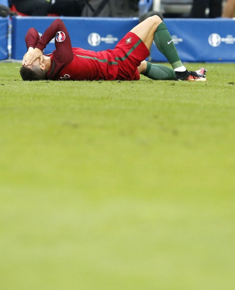 Zranený portugalský futbalista Cristiano Ronaldo počas finálového zápasu na majstrovstvách Európy. Paríž, 10. júl 2016. Foto: SITA/AP