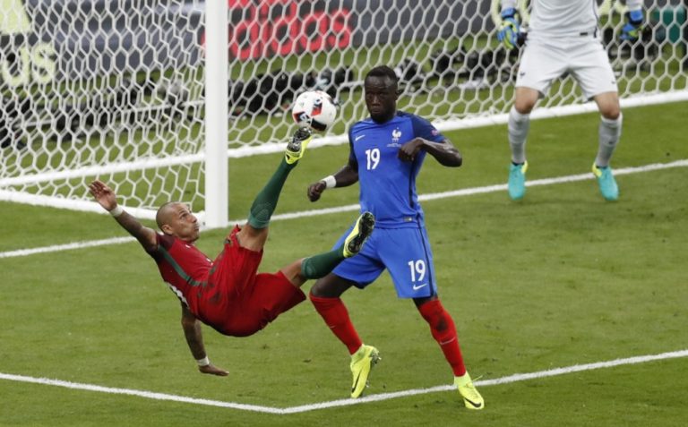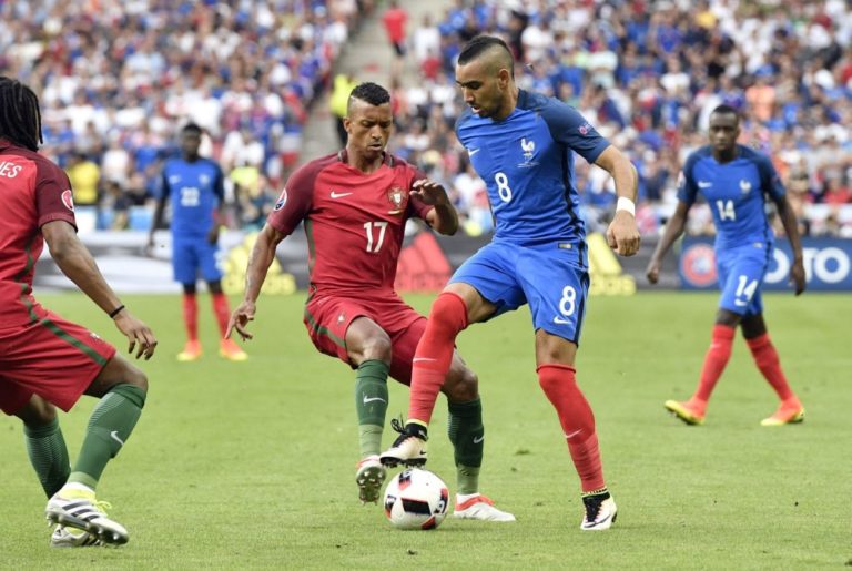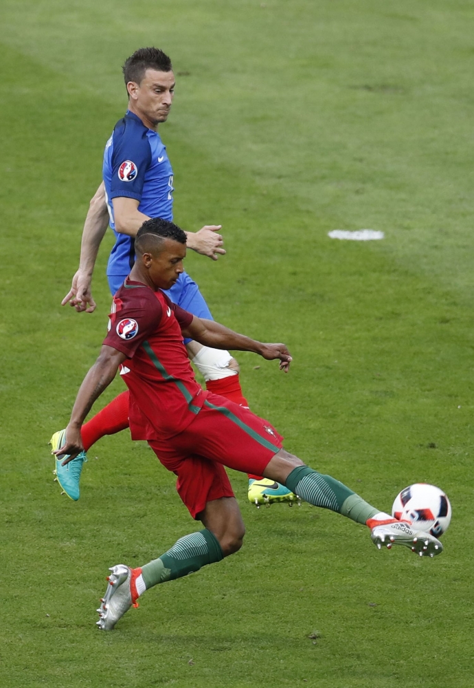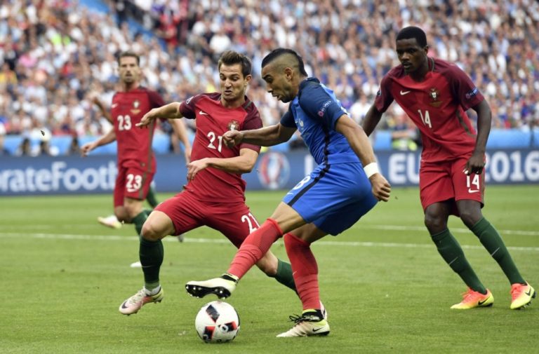 Portugalský futbalista Nani v súboji s Francúzmi počas finálového zápasu na majstrovstvách Európy. Paríž, 10. júl 2016. Foto: SITA/AP