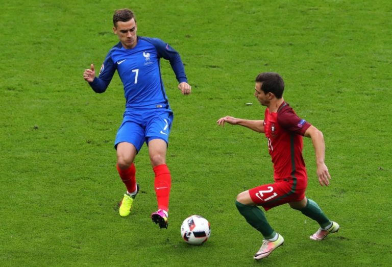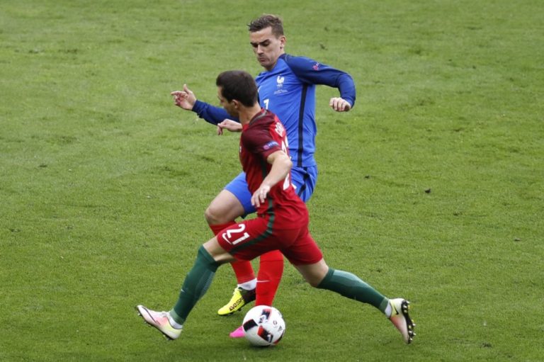Francúz Antoine Griezmann v súboji s portugalským futbalistom Williamom Carvalhom počas finálového zápasu na majstrovstvách Európy. Paríž, 10. júl 2016. Foto: SITA/AP