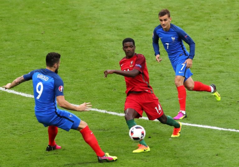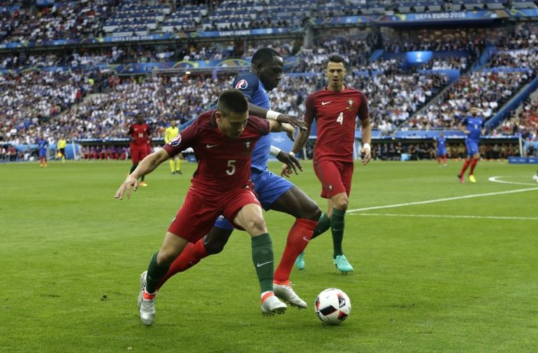 Portugalský futbalista William Carvalho v obkľúčení Francúzmi Olivierom Giroudom a Antoinom Griezmannom počas finálového zápasu na majstrovstvách Európy. Paríž, 10. júl 2016. Foto: SITA/AP