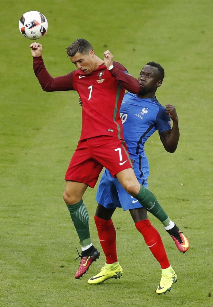 Francúz Bacary Sagna v súboji s portugalskou hviezdou Cristianom Ronaldom počas finálového zápasu na majstrovstvách Európy. Paríž, 10. júl 2016. Foto: SITA/AP