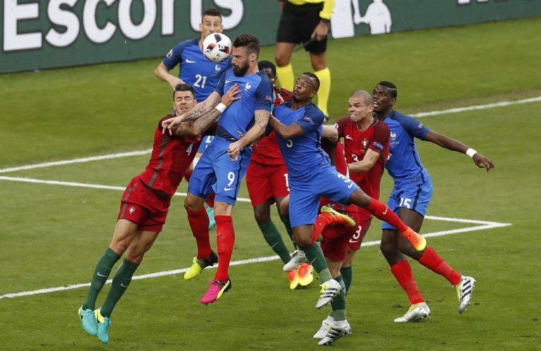 Francúz Olivier Giroud hlavičkuje loptu na portugalskú bránku počas finálového zápasu na majstrovstvách Európy. Paríž, 10. júl 2016. Foto: SITA/AP