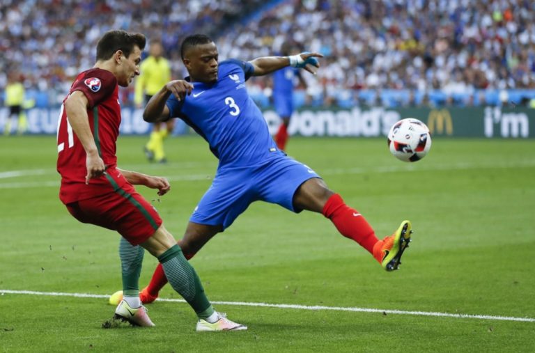 Francúz Patrice Evra v súboji s portugalským futbalistom Cédricom počas finálového zápasu na majstrovstvách Európy. Paríž, 10. júl 2016. Foto: SITA/AP