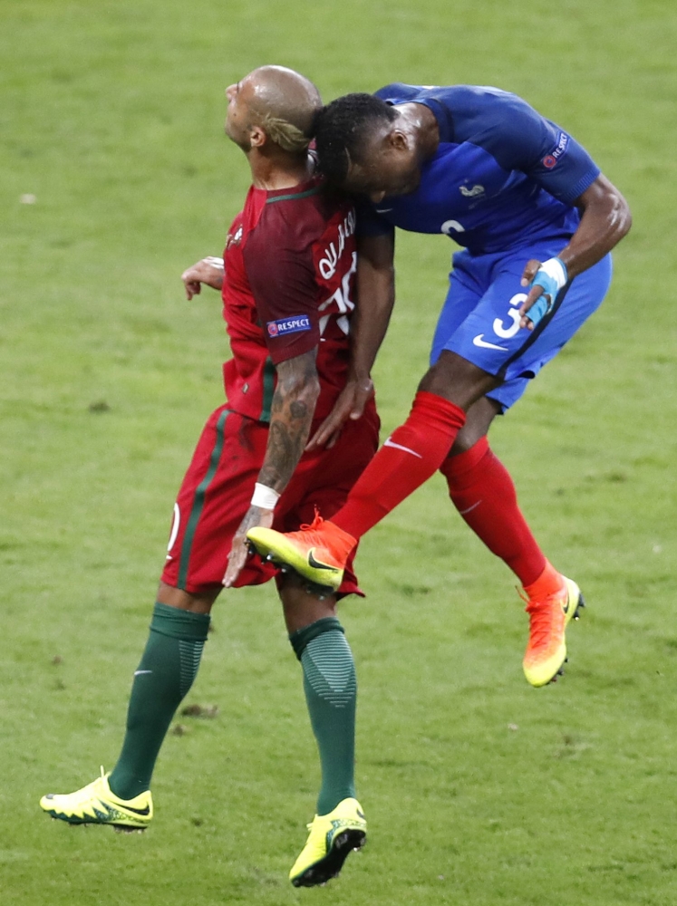 Francúz Bacary Sagna v súboji s portugalským futbalistom Josem Fontem počas finálového zápasu na majstrovstvách Európy. Paríž, 10. júl 2016. Foto: SITA/AP