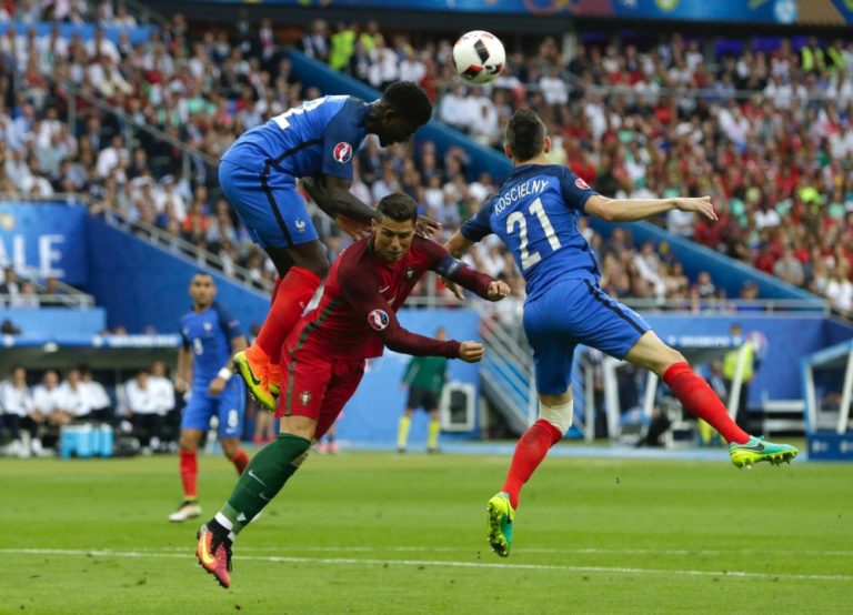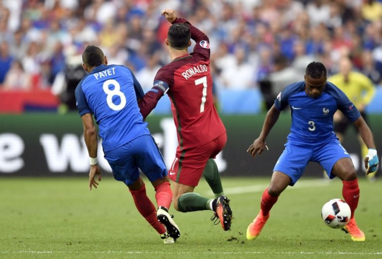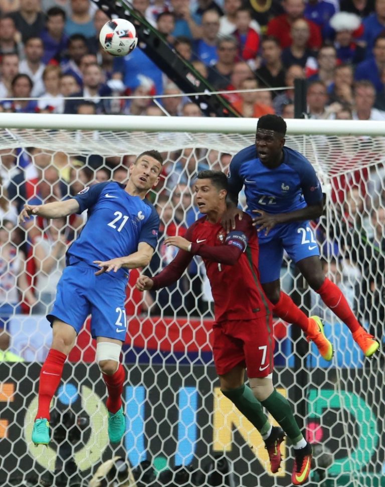 Francúzi Laurent Koscielny a Samuel Umtiti v súboji s portugalským futbalistom Cristianom Ronaldom počas finálového zápasu na majstrovstvách Európy. Paríž, 10. júl 2016. Foto: SITA/AP