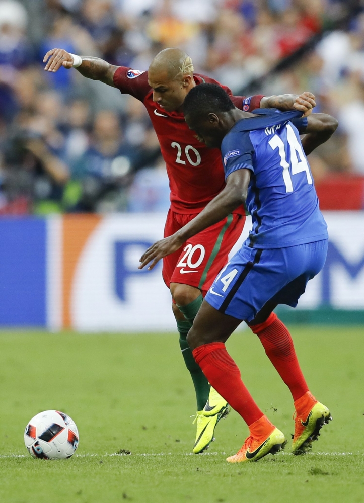 Francúz Blaise Matuidi v súboji s portugalským futbalisom Ricardom Quaresmom počas finálového zápasu na majstrovstvách Európy. Paríž, 10. júl 2016. Foto: SITA/AP