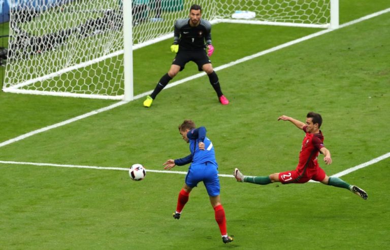 Francúz Antoine Griezmann strieľa na portugalskú bránku počas finálového zápasu na majstrovstvách Európy. Paríž, 10. júl 2016. Foto: SITA/AP