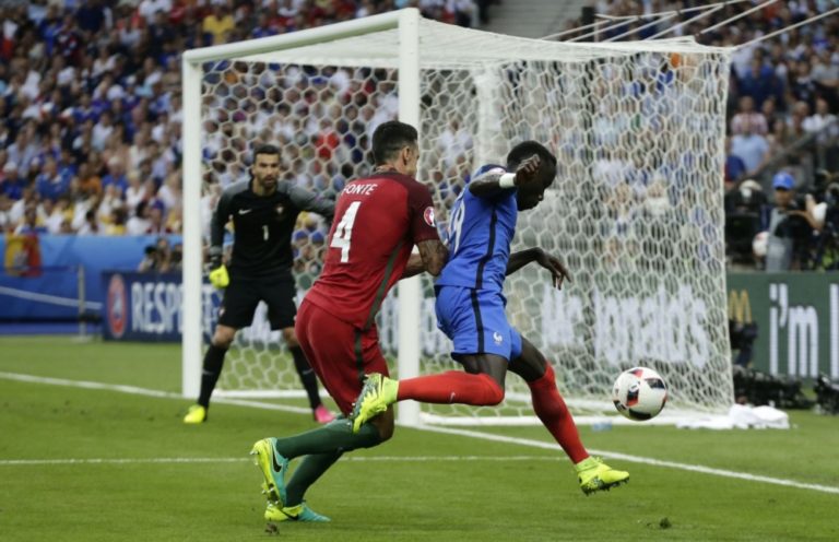 Francúz Moussa Sissoko v súboji s portugalským futbalistom Raphaelom Guerreirom počas finálového zápasu na majstrovstvách Európy. Paríž, 10. júl 2016. Foto: SITA/AP