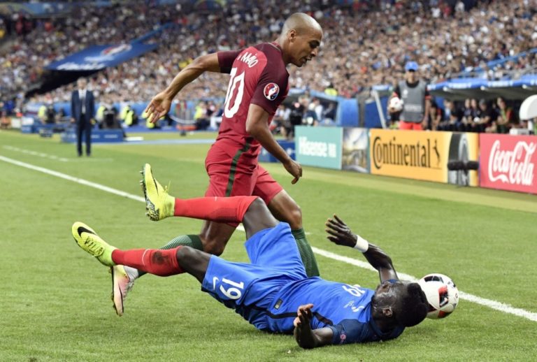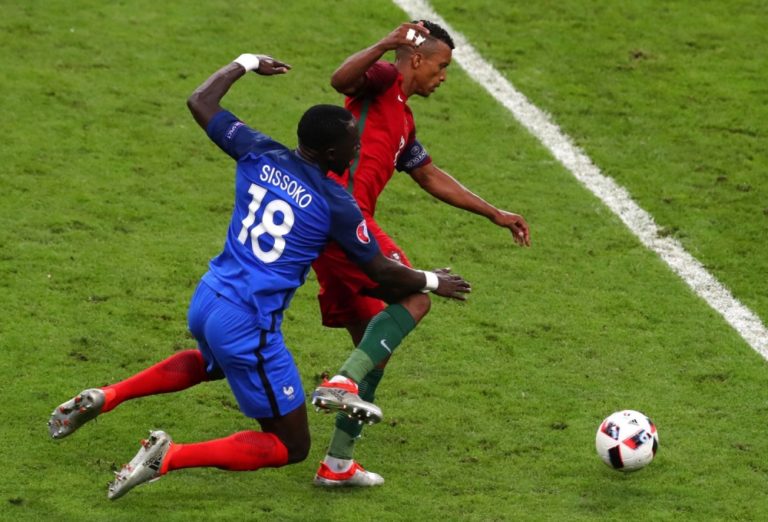 Francúz Moussa Sissoko v súboji s portugalským futbalistom Nanim počas finálového zápasu na majstrovstvách Európy. Paríž, 10. júl 2016. Foto: SITA/AP