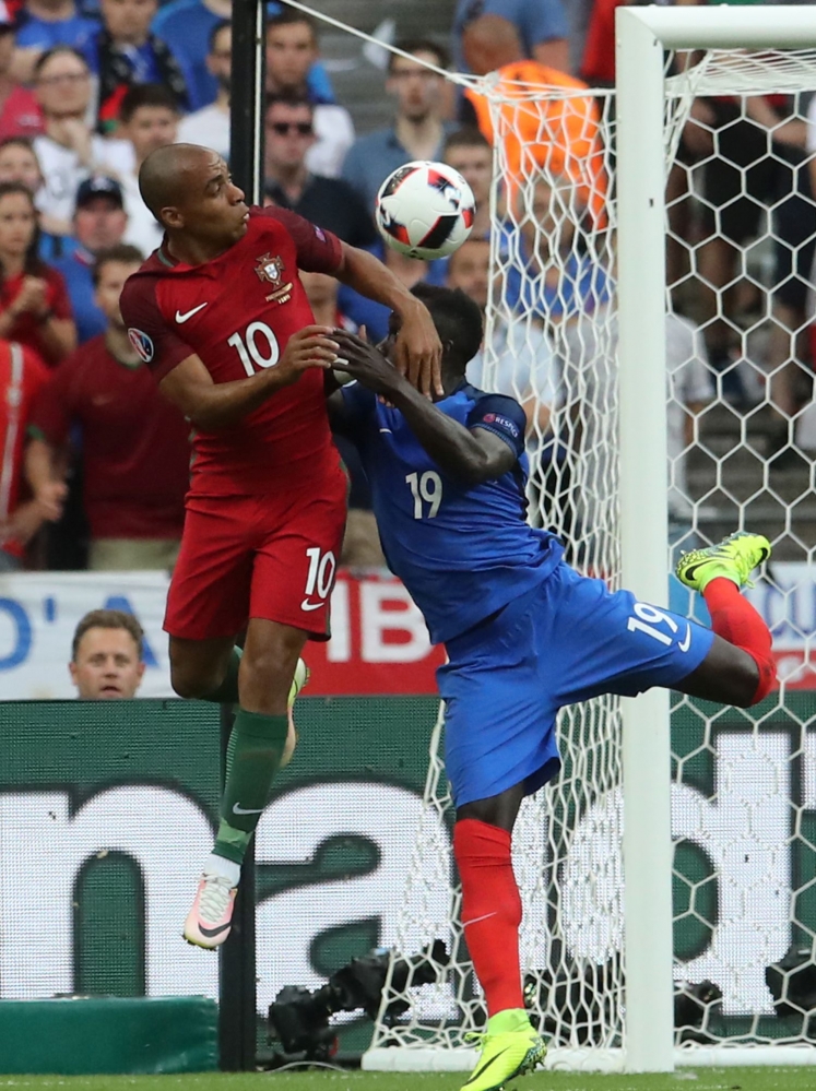 Francúz Bacary Sagna v súboji s portugalským futbalistom Joaom Mariom počas finálového zápasu na majstrovstvách Európy. Paríž, 10. júl 2016. Foto: SITA/AP