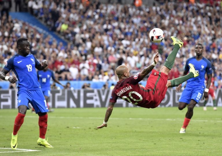 Portugalský futbalista Ricardo Quaresma odkopáva loptu počas finálového zápasu na majstrovstvách Európy. Paríž, 10. júl 2016. Foto: SITA/AP