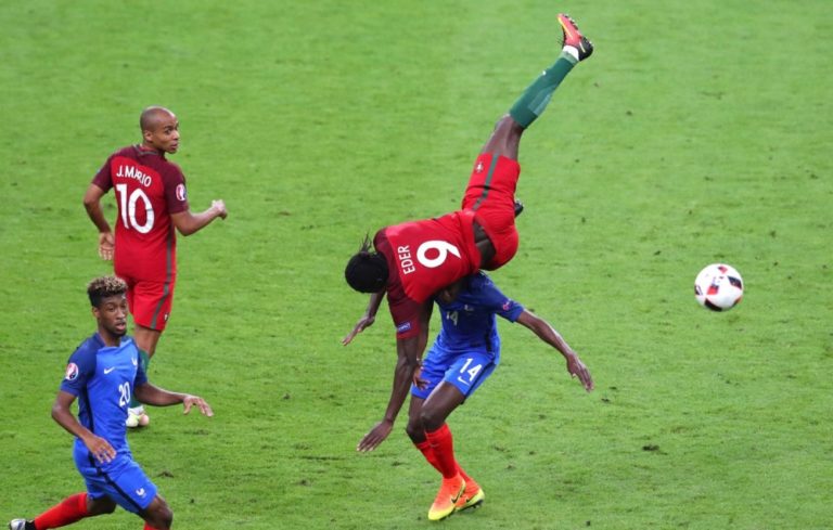Francúz Blaise Matuidi v súboji s portugalským futbalistom Éderom počas finálového zápasu na majstrovstvách Európy. Paríž, 10. júl 2016. Foto: SITA/AP