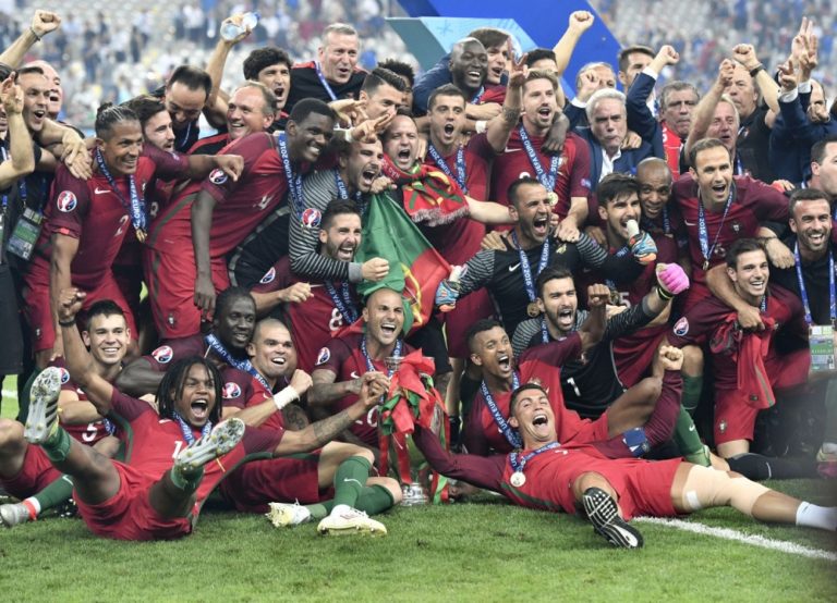 Radosť portugalských futbalistov po finálovom zápase majstrovstiev Európy, v ktorom zdolali Francúzov. Paríž, 10. júl 2016. Foto: SITA/AP