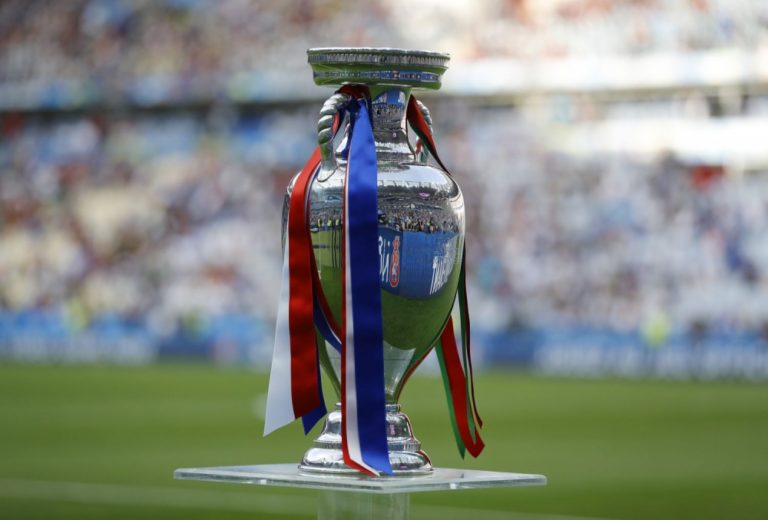 Pohár pre vítaza majstrovstiev Európy vo futbale pred finálovým zápasom medzi Portugalskom a Francúzskom. Paríž, 10. júl 2016. Foto: SITA/AP