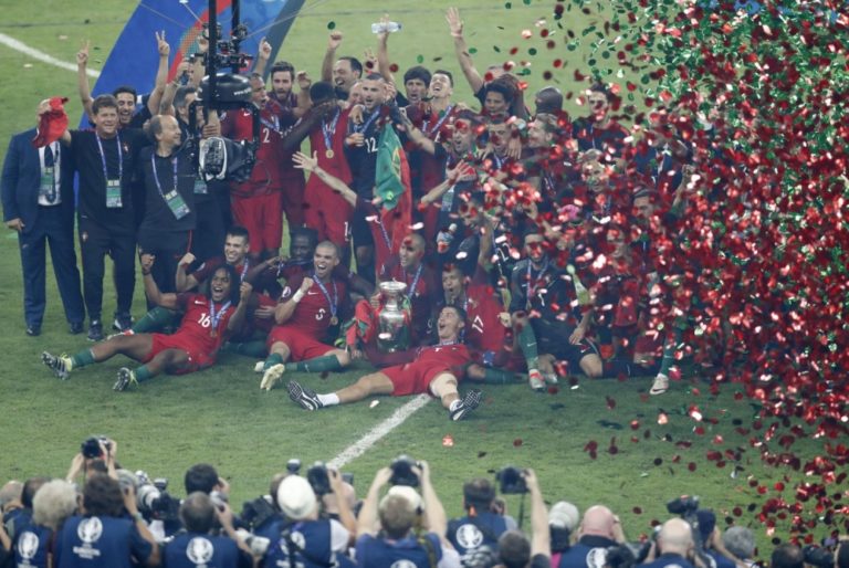 Radosť portugalských futbalistov s víťaznou trofejou po finálovom zápase majstrovstiev Európy, v ktorom zdolali Francúzov. Paríž, 10. júl 2016. Foto: SITA/AP