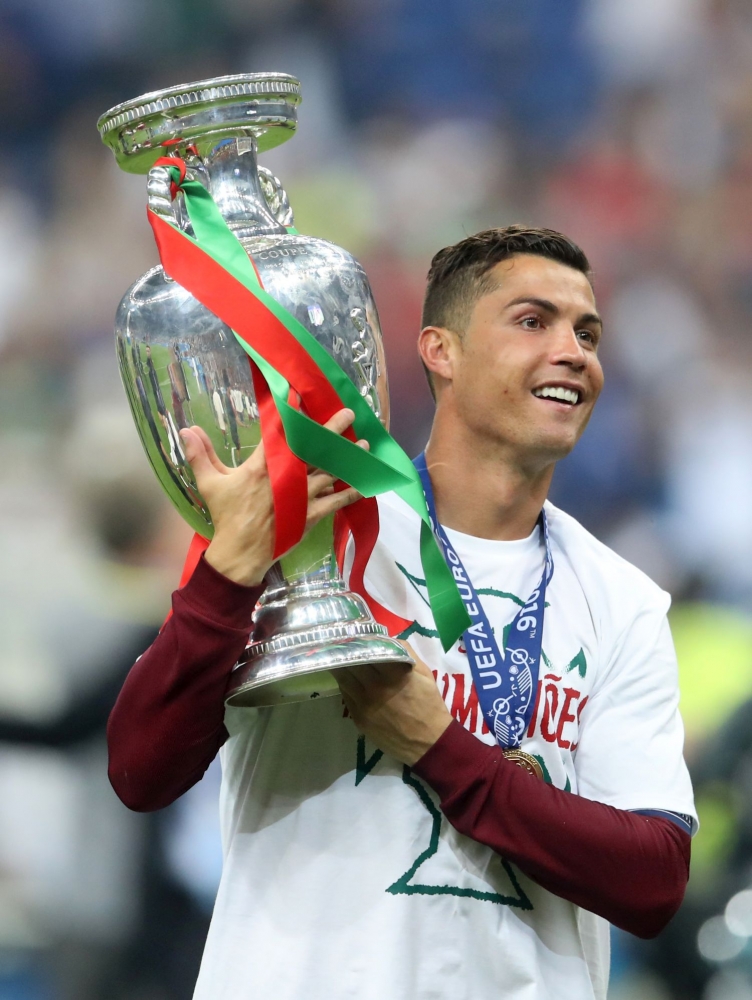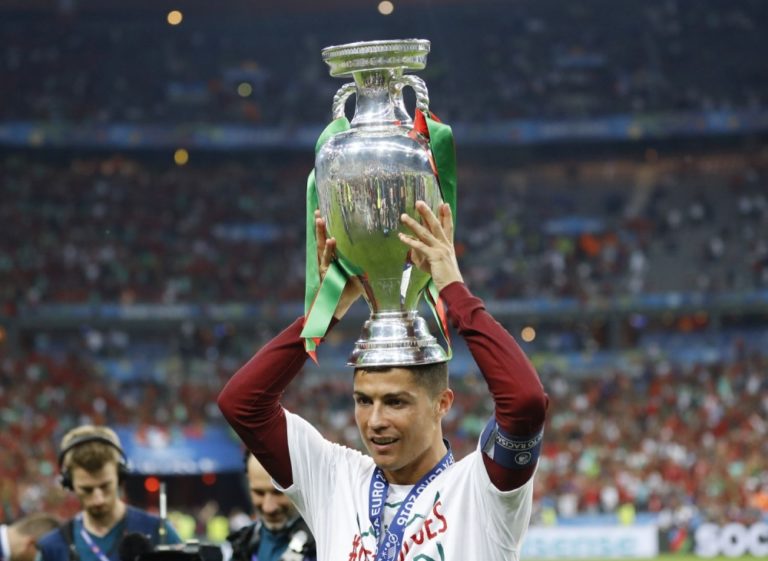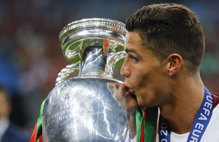 Radosť Cristiana Ronalda po finálovom zápase majstrovstiev Európy, v ktorom Portugalčania zdolali Francúzov. Paríž, 10. júl 2016. Foto: SITA/AP